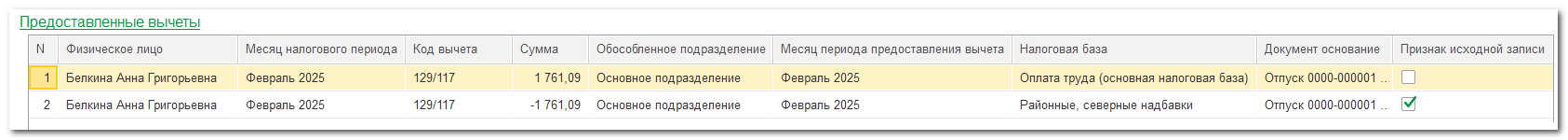 На вкладке "Физические лица" по каждому сотруднику предварительно будут заполнены табличные части "Сведения о доходах", "Предоставленные вычеты", "Налог исчисленный", "Налог удержанный", в которых соответствующие суммы доходов, вычетов, исчисленного и удержанного налога переносятся с базы "Районные, северные надбавки" на "основную" налоговую базу.