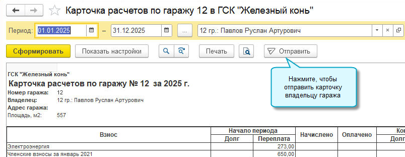 Добавлена возможность рассылать владельцам гаражей квитанции и карточки расчетов через мессенджеры Telegram, WhatsApp и социальную сеть ВКонтакте.