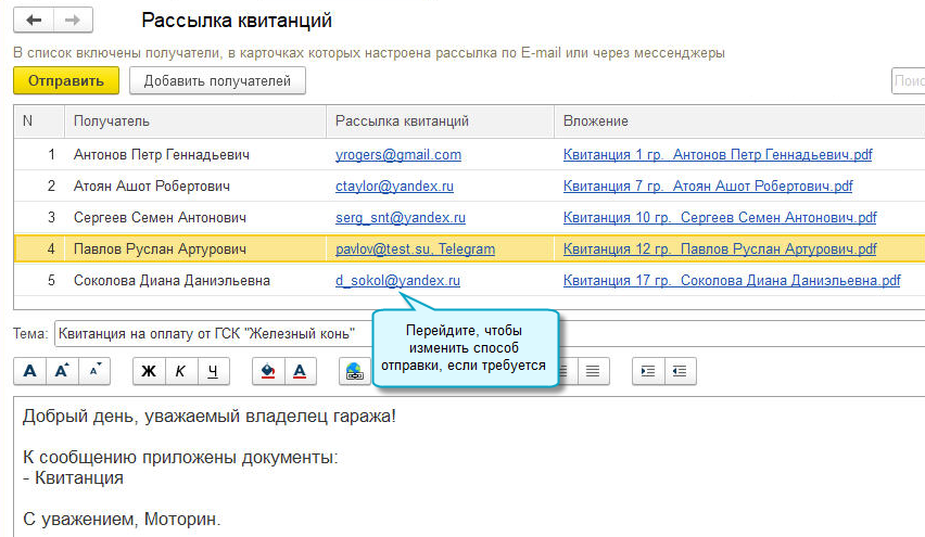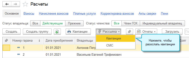 Рассылку квитанций можно выполнить из списка владельцев или карточки владельца.