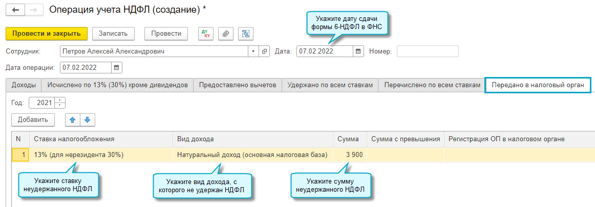 Добавлена возможность списать неудержанный НДФЛ, переданный на взыскание в налоговые органы. В документ Операция учета НДФЛ добавлена закладка Передано в налоговый орган. Проведите Операцию после отражения неудержанной суммы налога в форме 6-НДФЛ.