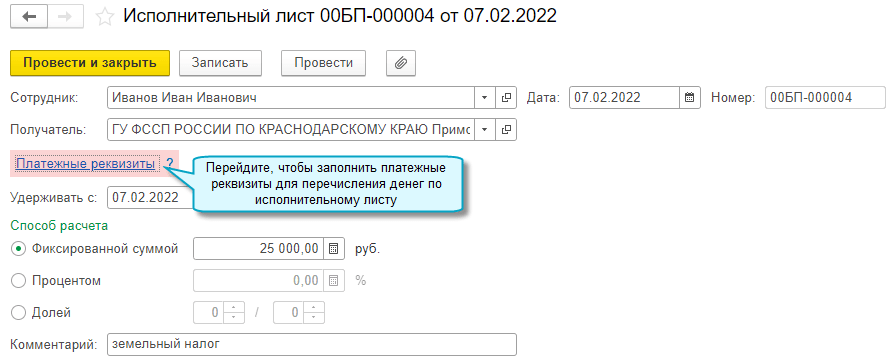 Добавлена возможность автоматического заполнения платежных реквизитов при перечислении денежных средств по исполнительным листам сотрудников. Подробные правила заполнения платежных поручений см. в приложениях к приказу Минфина от 12.11.2013 №107н в редакции приказа Минфина от 14.09.2020 №199н.