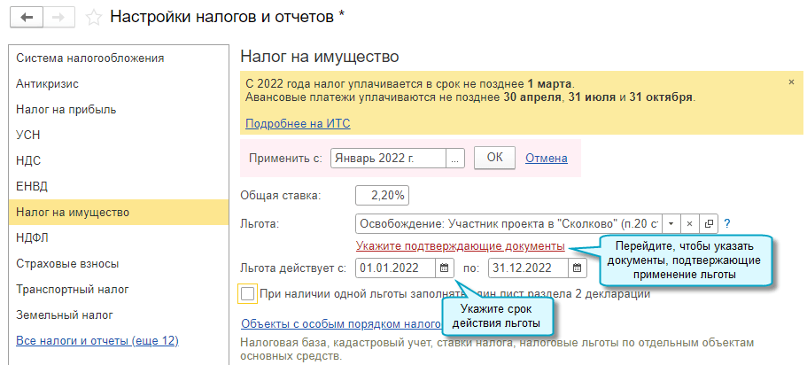 Добавлена возможность заполнить заявление о предоставлении налоговой льготы по налогу на имущество организаций. Заявление используется с 01.01.2022 при льготировании имущества, налог с которого рассчитывается по кадастровой стоимости (Приказ ФНС от 09.07.2021 № ЕД-7-21/646@).