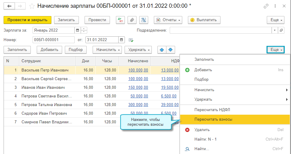 Простой интерфейс: меню "Сотрудники - Начисления".