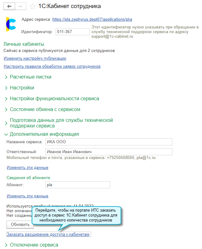 Добавлена возможность перейти на портал ИТС, чтобы заказать и купить доступ в сервис 1С:Кабинет сотрудника для необходимого количества сотрудников.