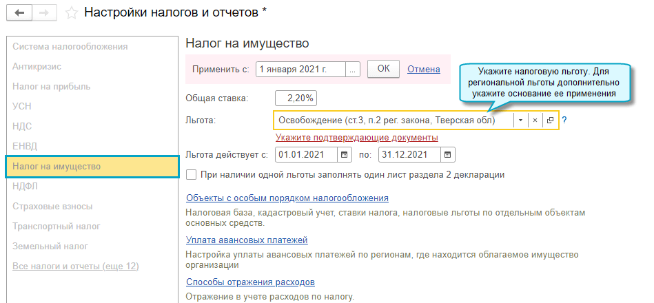 Простой интерфейс: меню "Настройки - Настройка налогов и отчетов - Налог на имущество".