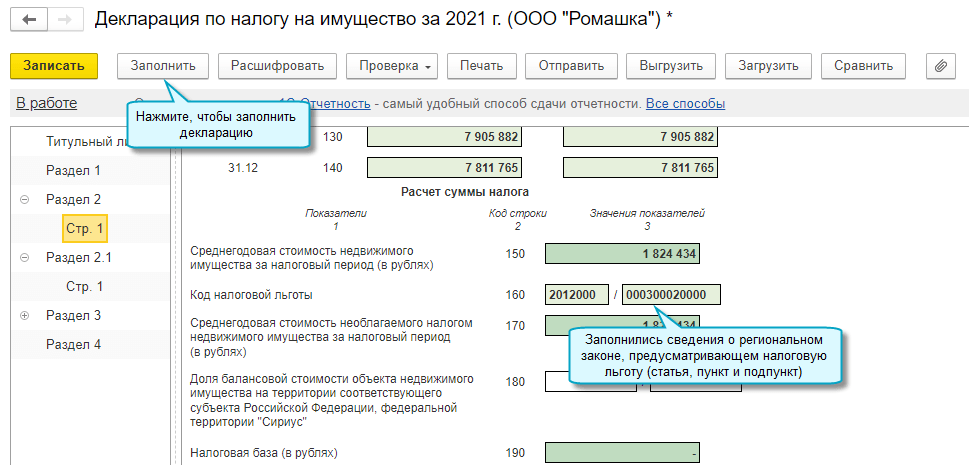 Для автозаполнения основания применения региональной налоговой льготы в декларации за 2021 год необходимо повторно выполнить регламентную операцию Расчет налога на имущество за декабрь 2021 года.