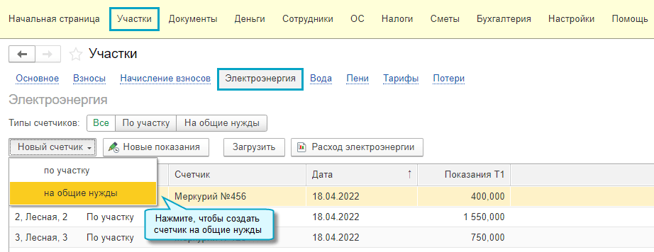 Простой интерфейс: меню "Участки - Электроэнергия".