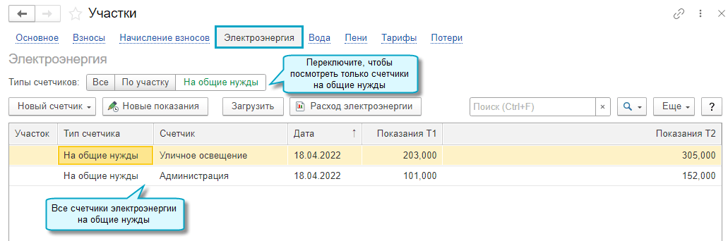 Добавлена возможность вести учет показаний счетчиков электроэнергии и воды на общие нужды СНТ (уличное освещение, обслуживание водозаборной скважины и др.).