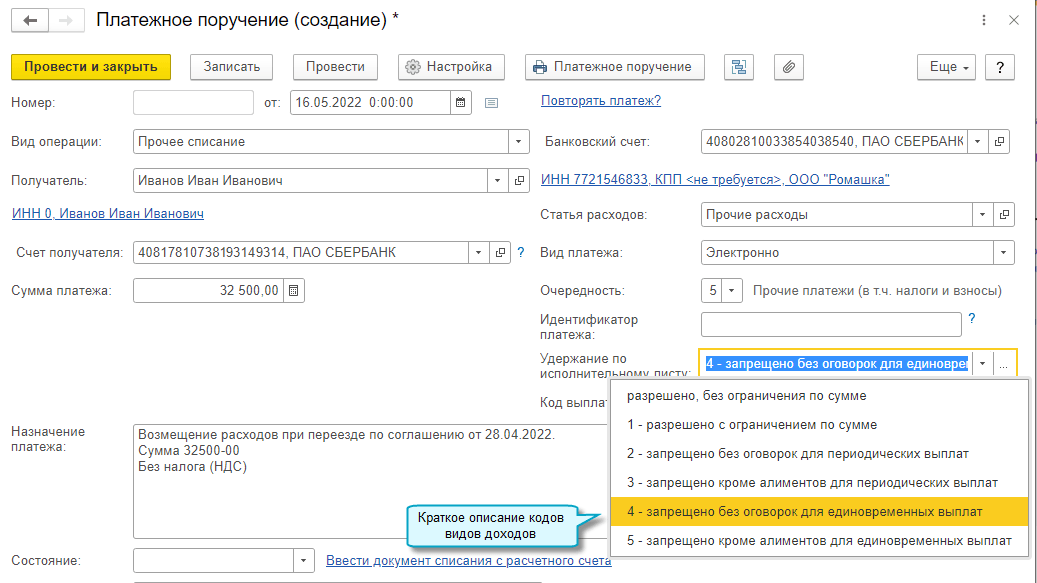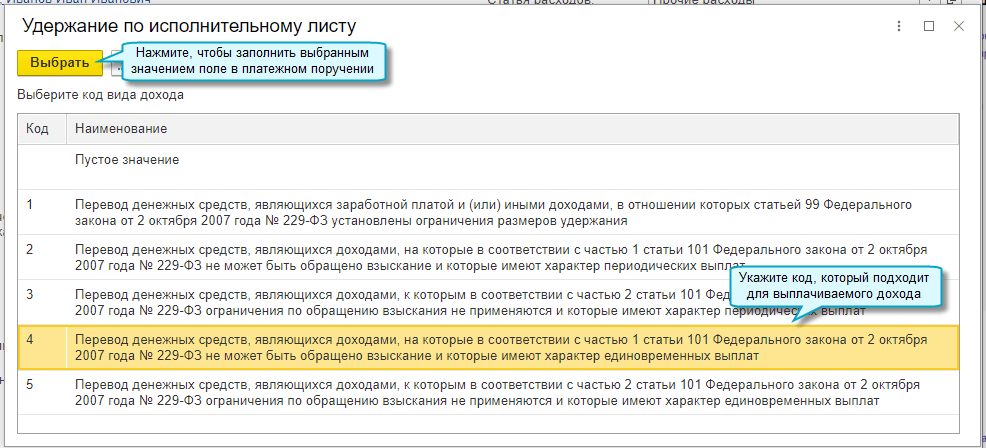 С 01.05.2022 изменены коды видов доходов для удержаний по исполнительным листам, которые указываются в платежных поручениях на перечисление физическим лицам заработной платы и других доходов. Теперь код вида дохода выбирается в зависимости от вида дохода (заработная плата, компенсация расходов по служебной командировке, оплата по договору подряда и др.) и характера выплат (единовременные или периодические). По коду дохода банком определяется возможность удержания с физического лица сумм по исполнительным листам (Указание Банка России от 25.03.2022 № 6104-У).