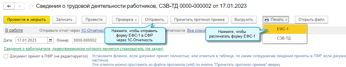 Аналогично распечатываются и отправляются разделы формы ЕФС-1 из документов: