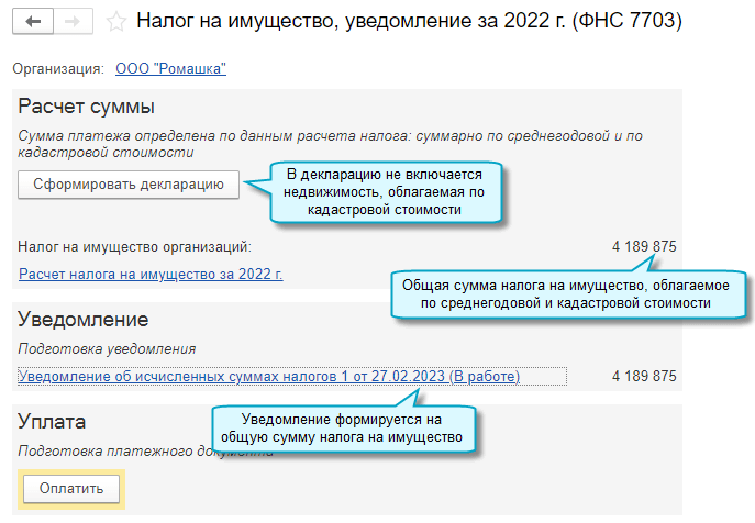 На авансовые платежи и налог по итогам года требуется отправлять в ФНС уведомление об исчисленных суммах налога, в связи с уплатой налога по реквизитам единого налогового платежа (ЕНП) на единый налоговый счет. Уведомление подается по налогу на имуществу, рассчитанному и по среднегодовой стоимости, и по кадастровой.