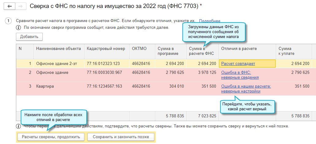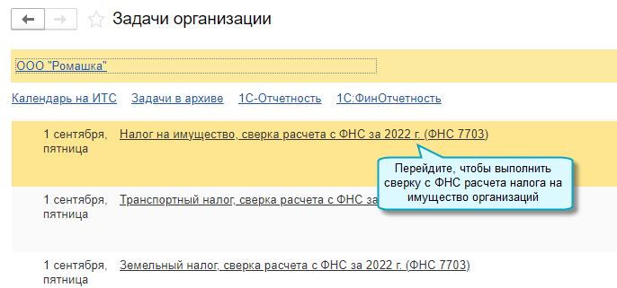 Сверка по налогу на имущество выполняется аналогично сверке расчетов по транспортному и земельному налогам.