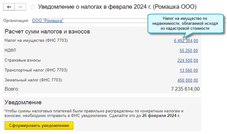 Добавлена возможность сформировать уведомление об исчисленной сумме налога на имущество по недвижимости, облагаемой налогом исходя из кадастровой стоимости (Письмо ФНС России от 17.10.2023 № БС-4-21/13243@).