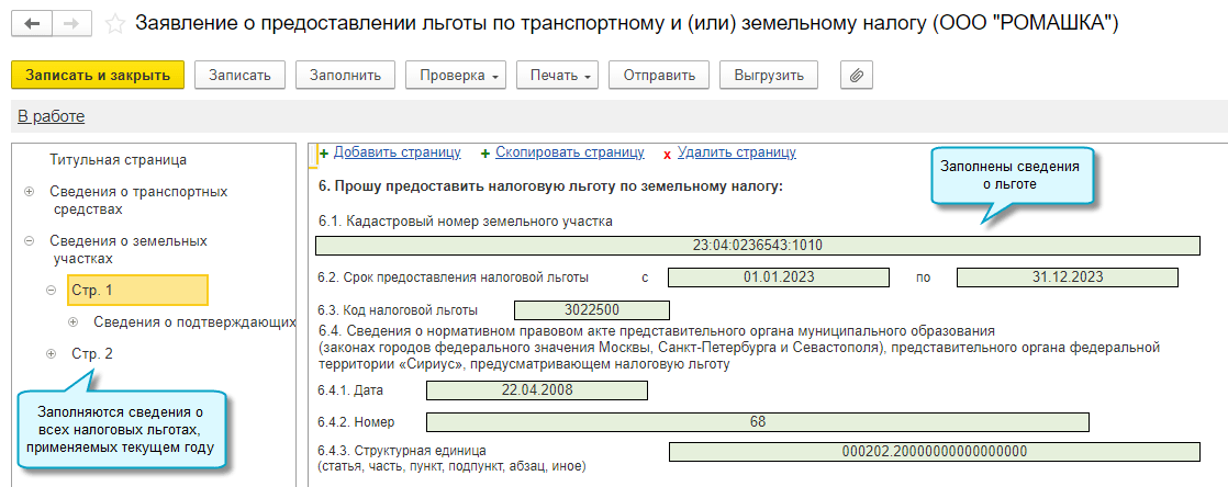 Добавлена возможность автозаполнения оснований применения налоговых льгот в заявлении о предоставлении льгот по земельному налогу.