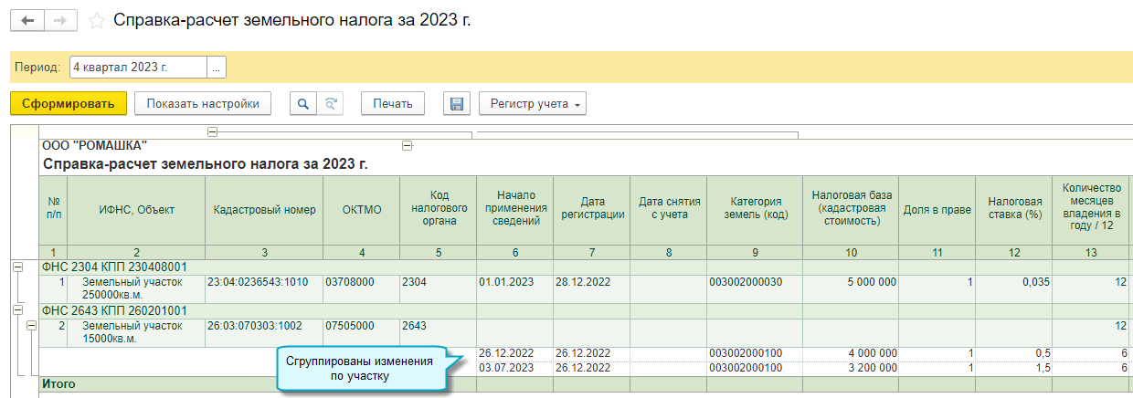 Изменена форма справки-расчета земельного участка, начиная с расчета за 2020 год. Она приближена к рассылаемым ФНС сообщениям об исчисленной сумме земельного налога. Изменения условий налогообложения в течение года теперь группируются по земельным участкам.