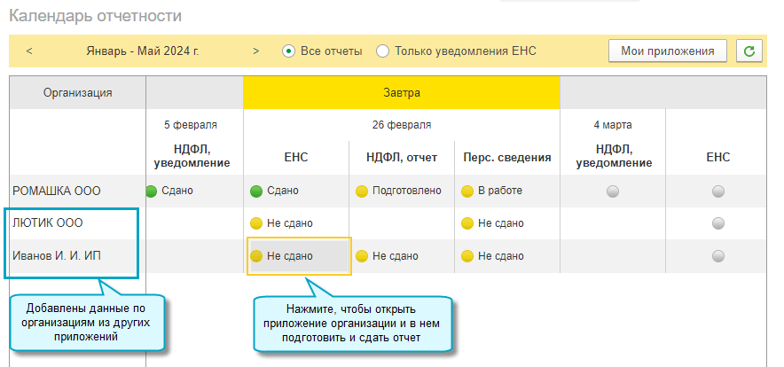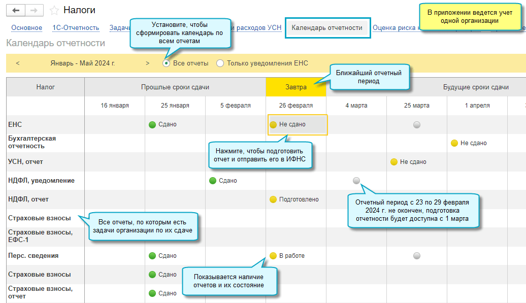 Добавлен календарь отчетности. Теперь можно проверить наличие и состояние всех отчетов, подготовить и отправить очередные по сроку сдачи.