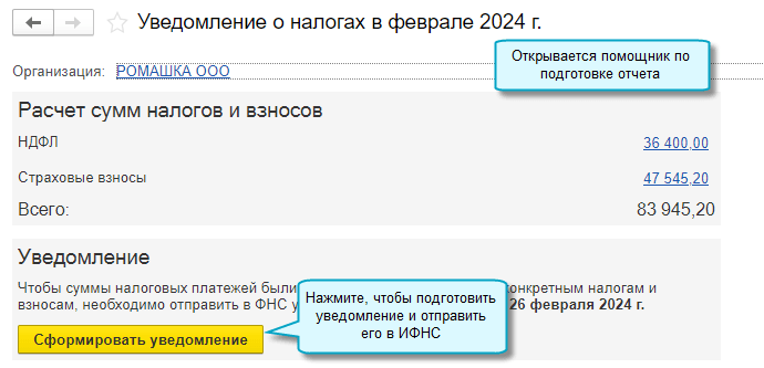 Для регламентированного отчета "Уведомление об исчисленных суммах налогов" (Уведомление об исчисленных суммах налогов, авансовых платежей по налогам, сборов, страховым взносам (КНД 1110355) в редакции приказа ФНС России от 02.11.2022 № ЕД-7-8/1047@) реализована проверка контрольных соотношений, введенных письмом ФНС России от 31.01.2024 № ЕА-4-15/971@.