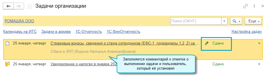 Добавлена возможность вручную отмечать задачи выполненными. Это пригодится, например, когда отчеты сдаются не через 1С-Отчетность.