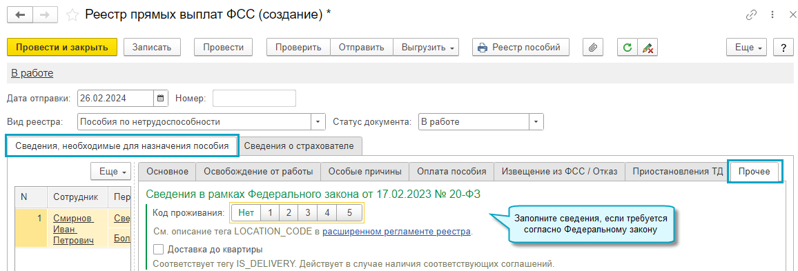 Добавлена возможность подачи сведений согласно Федеральному закону от 17.02.2023 № 20-ФЗ. Для этого в документ Реестр прямых выплат ФСС добавлена закладка "Прочее". Для подачи сведений о приостановлении трудового договора, добавлена закладка "Приостановления ТД".