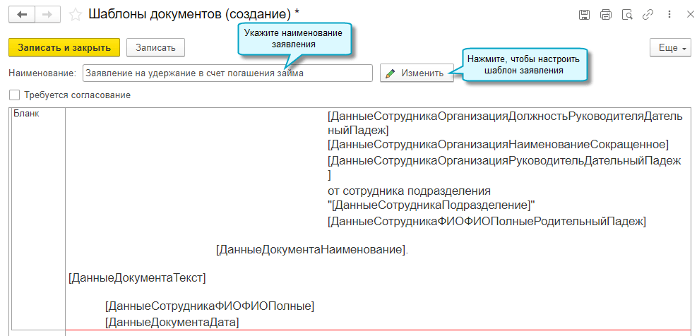 Добавлена возможность использовать свои формы заявлений, которые сотрудники направляют через сервис 1С:Кабинет сотрудника. Для этого достаточно настроить их шаблоны в справочнике "Шаблоны документов".