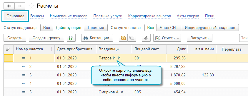 Простой интерфейс: меню "Расчеты - Основное - Отчеты - Реестр владельцев участков".