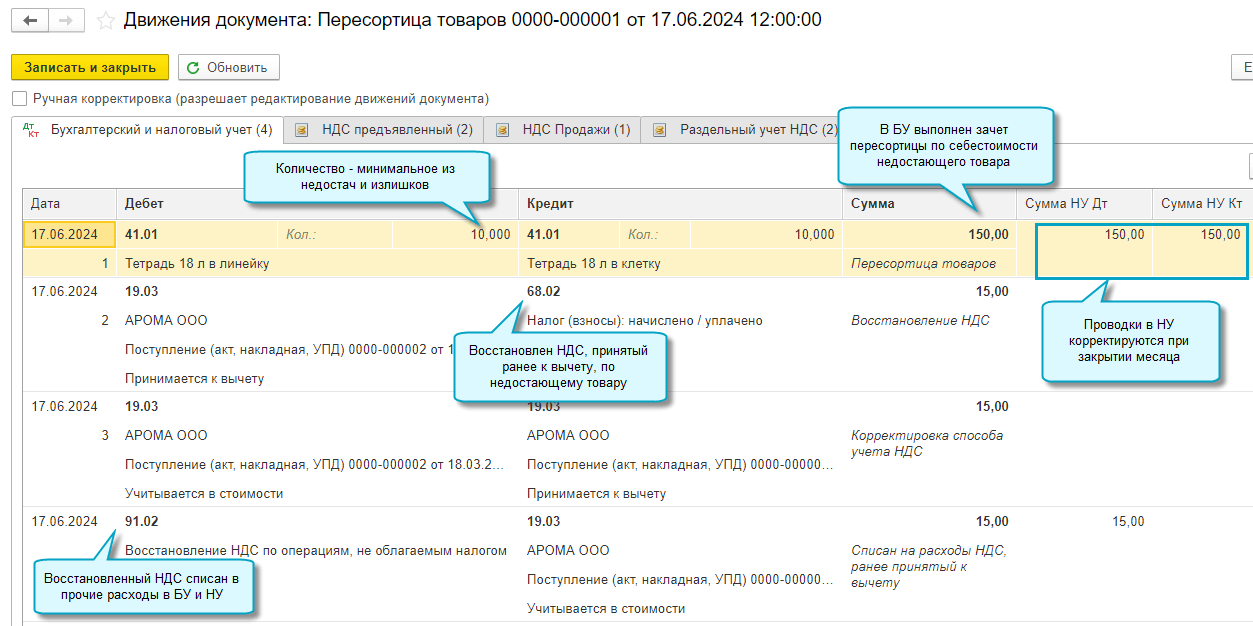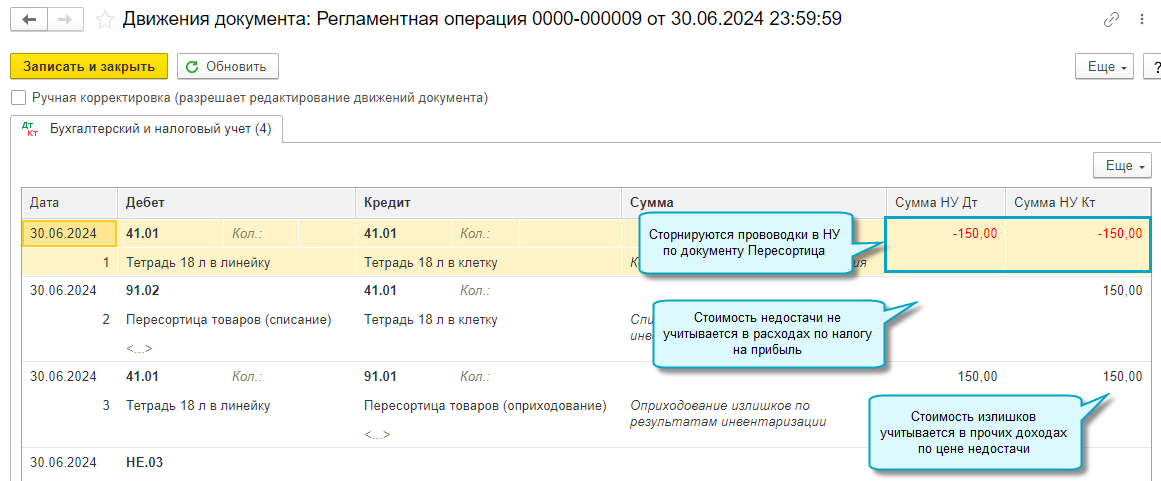 Порядок отражения зачета пересортицы в налоговом учете по налогу на прибыль корректируется при выполнении закрытия месяца регламентной операцией Корректировка стоимости номенклатуры.