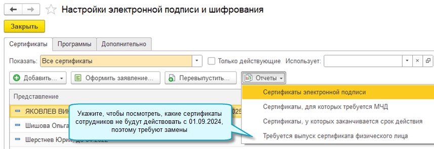 Для выявления таких сертификатов добавлен отчет в настройки электронной подписи и шифрования.