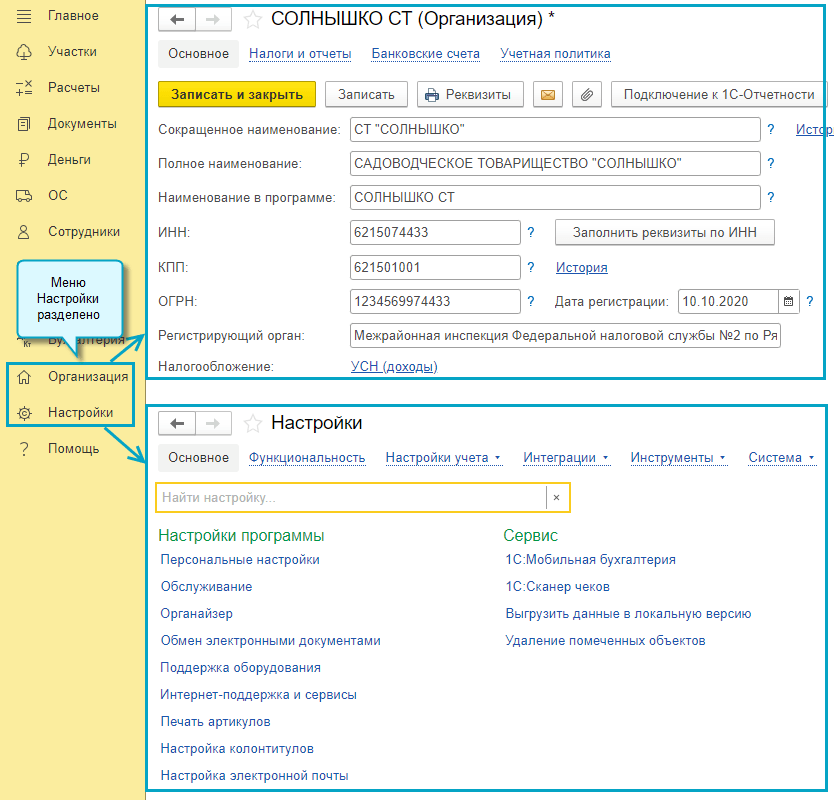 - Организация - реквизиты организации, настройки налогов и отчетов и учетной политики;