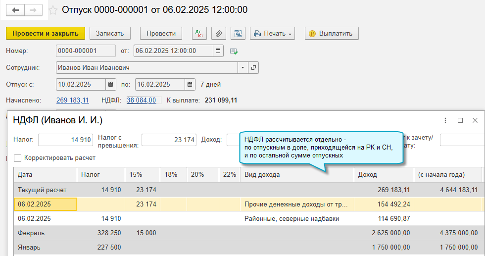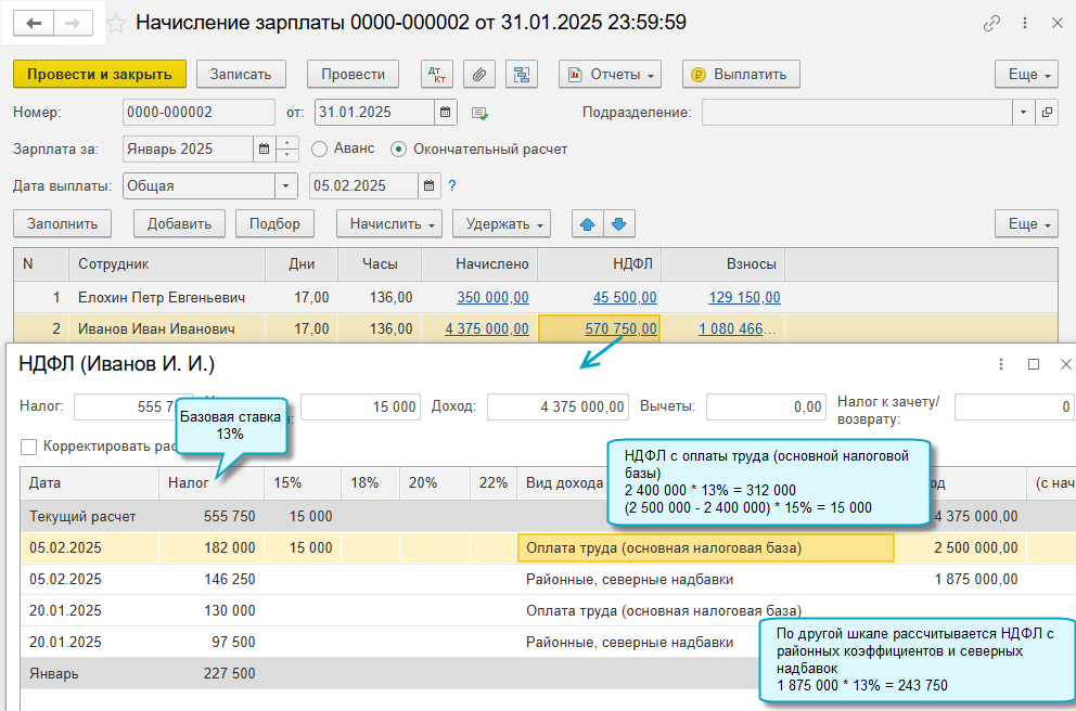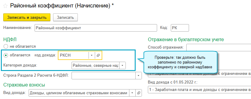 При начислении заработной платы, отпускных и больничных требуется выделять отдельно районные коэффициенты и северные надбавки, поскольку при расчете НДФЛ по ним применяется своя прогрессивная шкала.