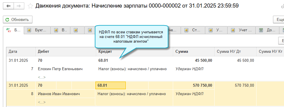 Удержанный НДФЛ по всем ставкам теперь учитывается на счете 68.01 "НДФЛ исчисленный налоговым агентом". На него перенесены все операции по субсчетам 68.01.1 и 68.01.2, используемым в прошлых версиях.
