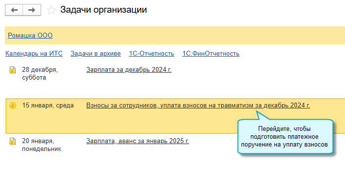 Добавлена задача организации по уплате взносов на травматизм со своим сроком выполнения. В прошлых версиях для подготовки платежного поручения использовалась задача по выплате заработной платы.