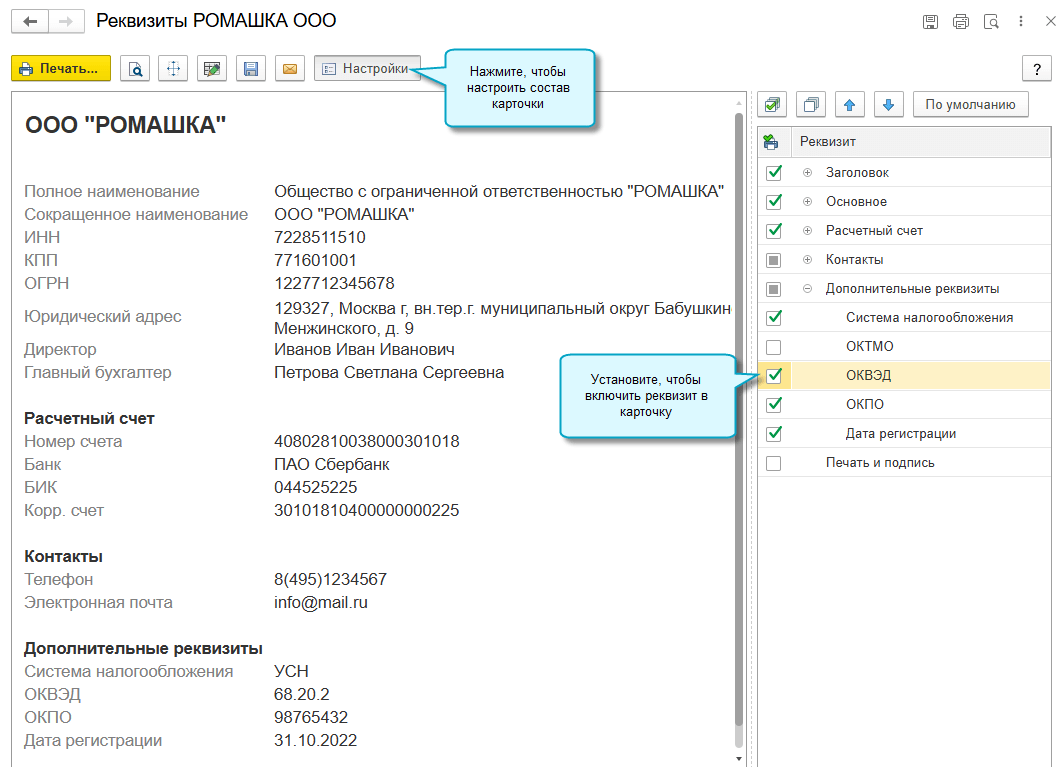 Расширен состав реквизитов, предлагаемых для заполнения. Теперь можно выводить адрес электронной почты, фактический адрес, ОКВЭД и др.