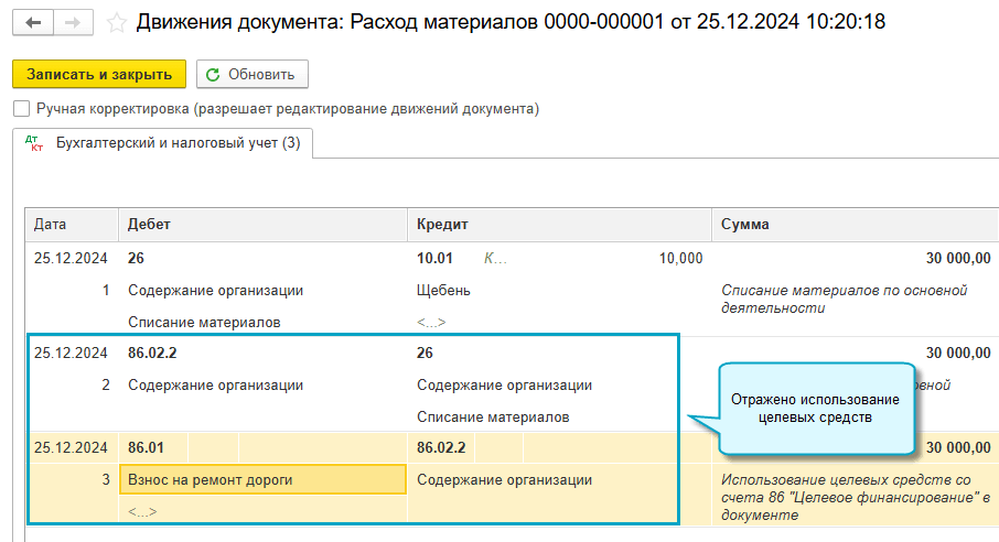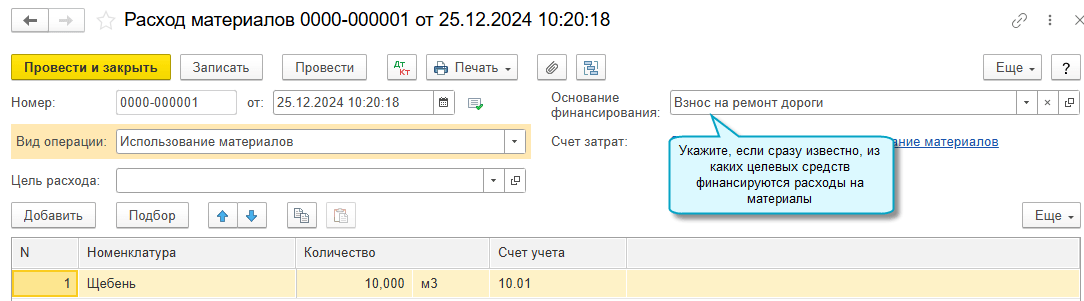 Добавлена возможность отражать использование целевых средств сразу при списании материалов, когда известно, из каких целевых средств финансируются расходы. Для этого достаточно указать основание финансирования в документе Расход материалов.