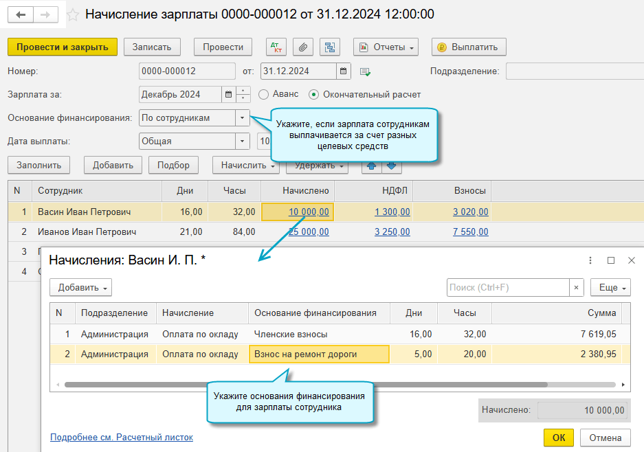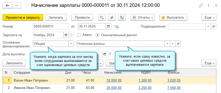 Поддержаны два варианта указания основания финансирования в Начислении зарплаты: