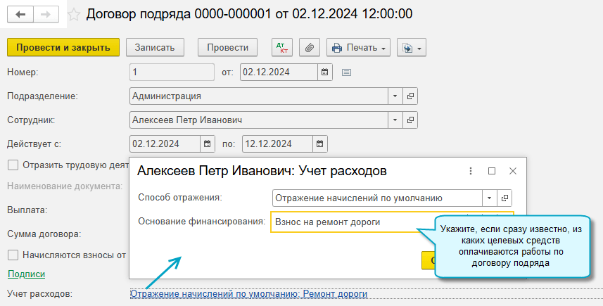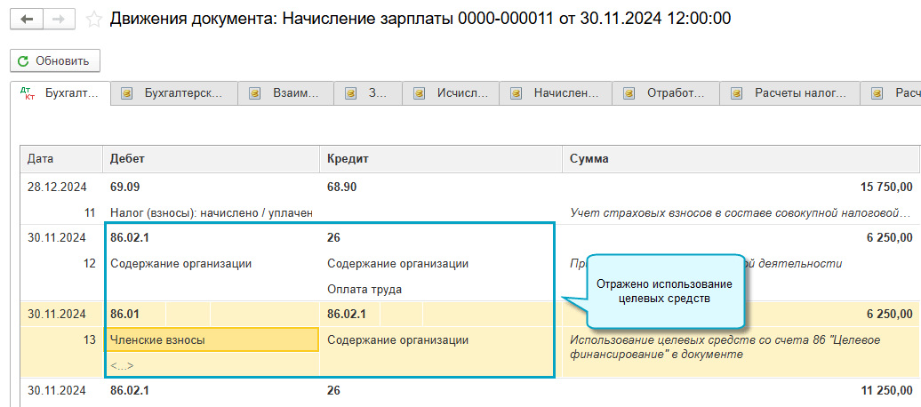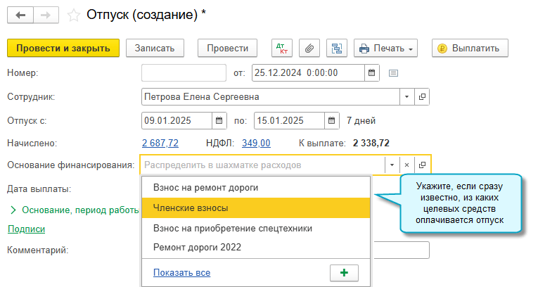 Добавлена возможность отражать использование целевых средств сразу при начислении зарплаты, отпускных, больничных, выплат по договорам подряда, когда известно, из каких целевых средств финансируются расходы. Для этого достаточно указать основание финансирования в документах начисления.