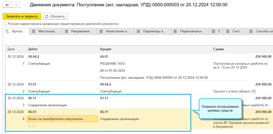Добавлена возможность отражать использование целевых средств сразу при поступлении основных средств, когда известно, из каких целевых средств финансируется их приобретение. Для этого достаточно указать основание финансирования в документе Поступление основных средств.