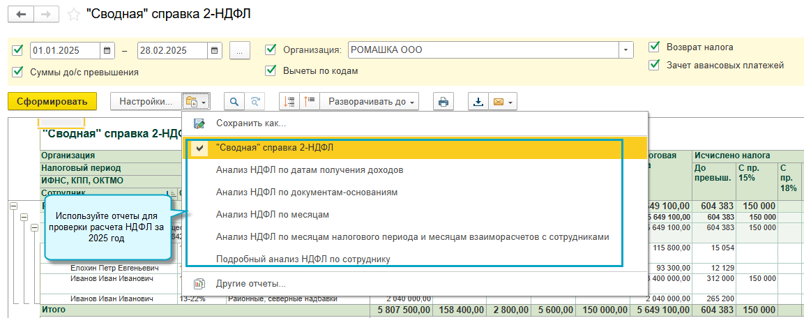 Отчеты по НДФЛ формируются с учетом ставок НДФЛ, действующих с 01.01.2025.