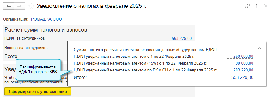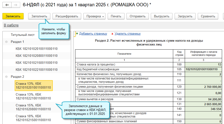 Реализовано заполнение формы 6-НДФЛ за 2025 год. Данные по доходам и вычетам заполняются с учетом ставок НДФЛ и КБК, применяемых с 01.01.2025.