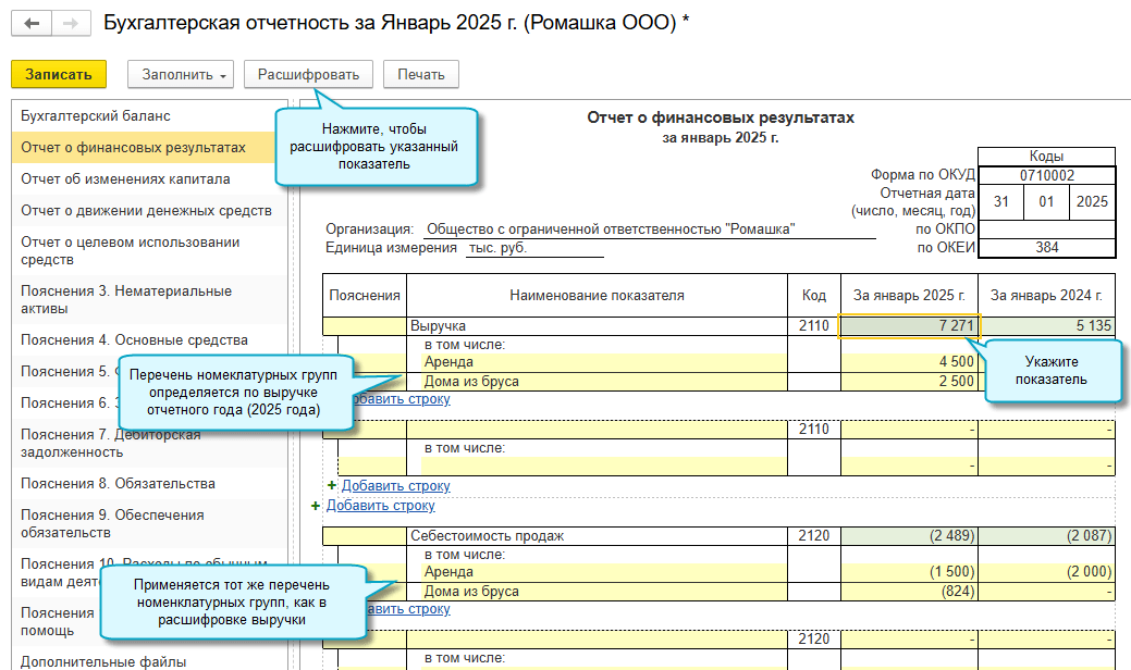 Добавлено автозаполнение отчета о финансовых результатах по форме, разработанной на основе образца, приведенного в ФСБУ 4/2023 "Бухгалтерская (финансовая) отчетность". Применяется такая форма начиная с отчетности за 2025 год.