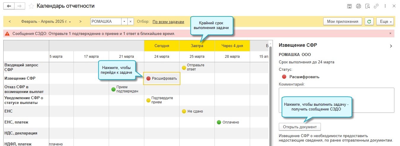 Со сроками выполнения показываются задачи по сообщениям СФР: