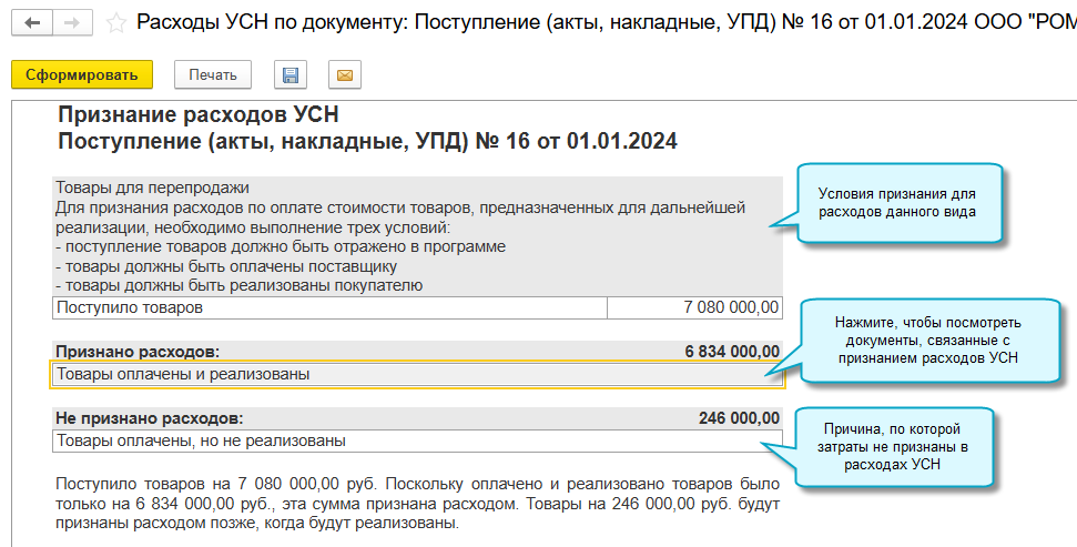 По документу можно сформировать отчет "Признание расходов УСН" с детальным анализом выполнения условий признания расходов УСН.