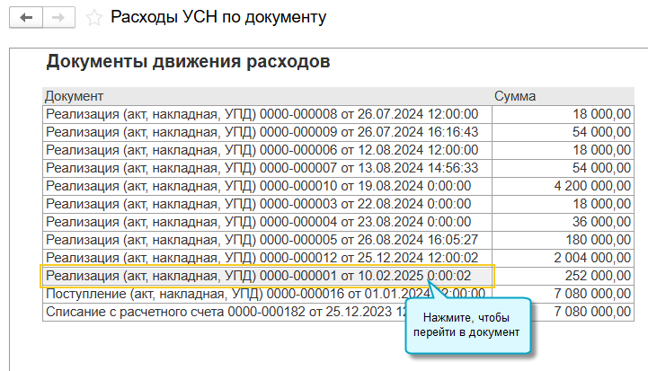 Отчет "Признание расходов УСН" по документу доступен также непосредственно в документах, связанных с признанием расходов УСН.
