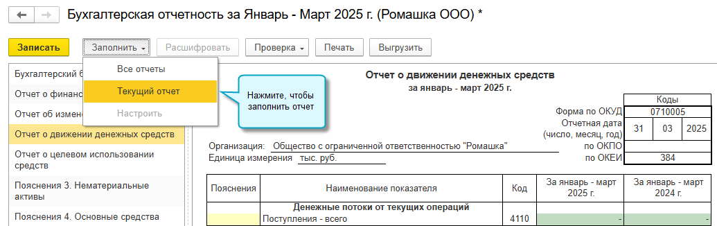 Добавлено автозаполнение отчета о движении денежных средств по форме, разработанной на основе образца, приведенного в ФСБУ 4/2023 "Бухгалтерская (финансовая) отчетность". Применяется такая форма начиная с отчетности за 2025 год.