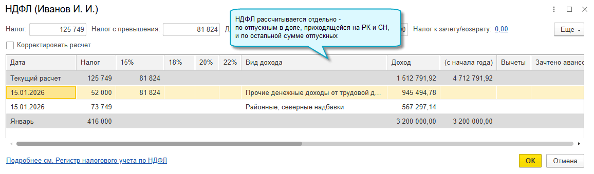 Начиная с 2026 года выделяются суммы районных коэффициентов и северных надбавок при выплате отпускных и компенсаций за неиспользованный отпуск при увольнении (Федеральный закон от 28.11.2025 № 425-ФЗ).