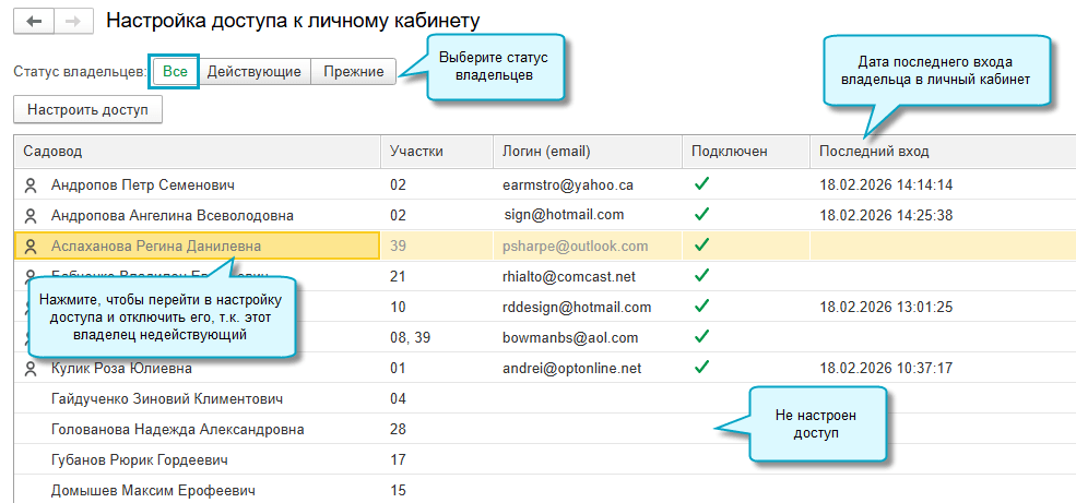 Список владельцев можно сформировать только по действующим или прежним. У недействующих владельцев можно отключить доступ.