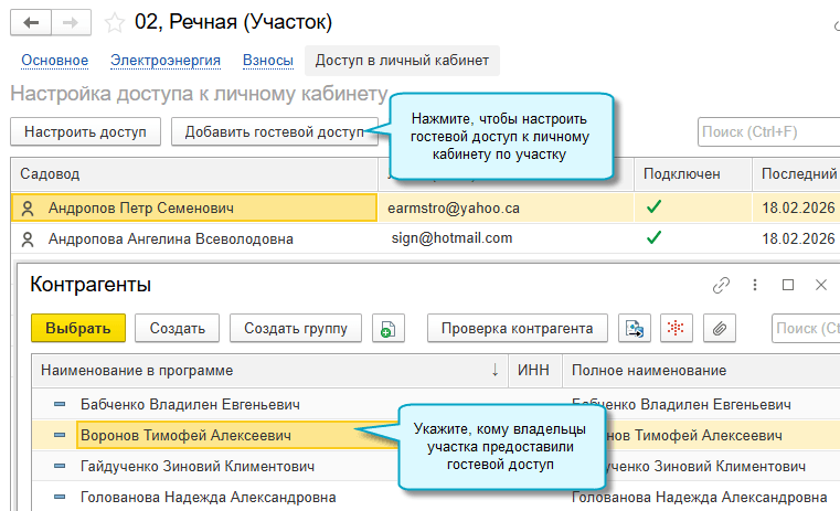 В карточке участка можно посмотреть, кто подключен к личному кабинету по этому участку. А в карточке владельца - посмотреть, к каким участкам у него есть доступ.