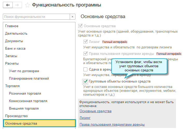 Полный интерфейс: меню "Главное - Настройки - Функциональность - Основные средства".