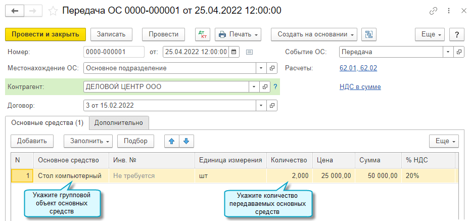 Полный интерфейс: меню "ОС и НМА - Выбытие основных средств - Передача ОС".