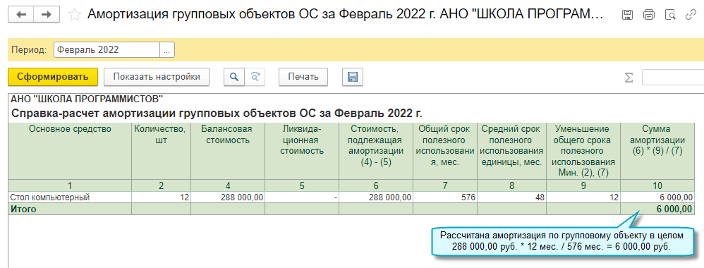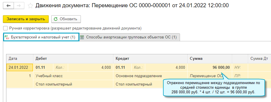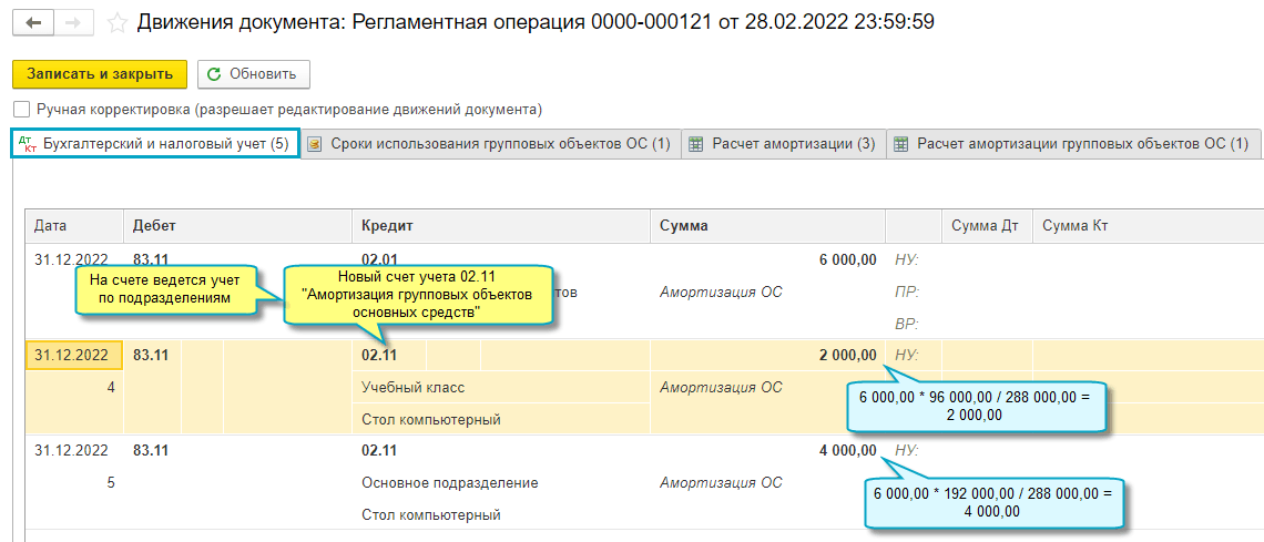 Амортизация группового объекта за месяц распределяется между подразделениями пропорционально балансовой стоимости (до начисления амортизации) находящихся в них основных средств.