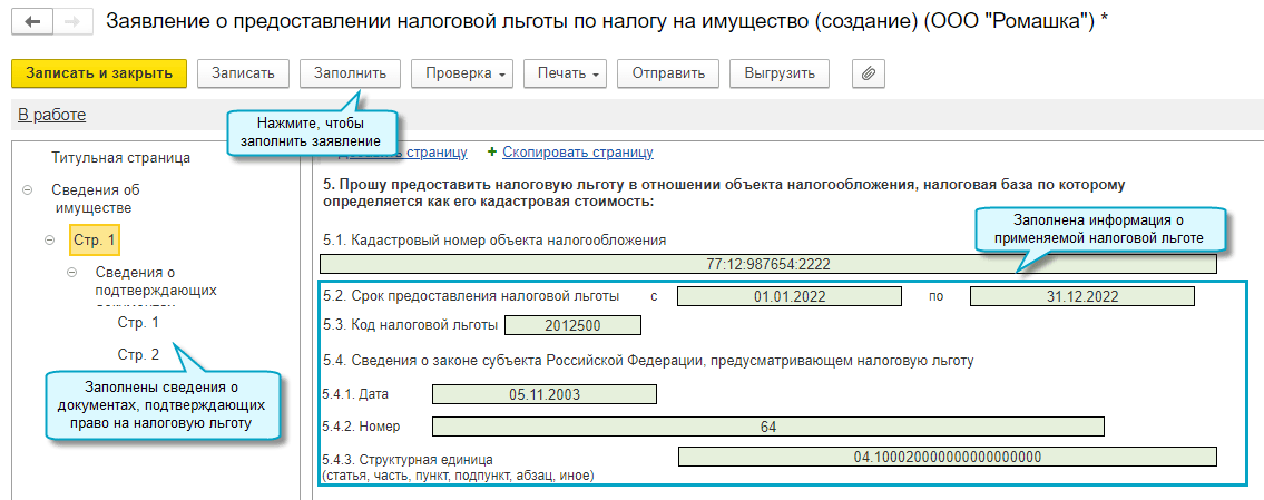 Добавлена возможность заполнить заявление о предоставлении налоговой льготы по налогу на имущество организаций. Заявление используется с 01.01.2022 при льготировании имущества, налог с которого рассчитывается по кадастровой стоимости (Приказ ФНС от 09.07.2021 № ЕД-7-21/646@).